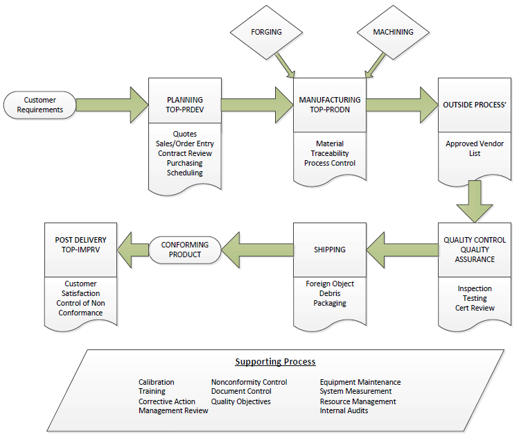 Trinity Forge & Machine (or simply “Trinity Forge”) maintains a quality system compliant with the ISO 9001:2015 and AS9100:2016 (rev D) standards with exclusion to section 8.3, and meeting standard MIL-I-45208. The only areas of those standards which we exclude are the provisions related to product design (AS9100D Section 8.3) because we produce components for products that our customers, not we, design and develop. This quality manual provides the basis of our quality system including our corporate mission statement, our quality policy, and a depiction of the interaction of the core processes within our quality system. Finally, it maps the elements of our quality system to ISO 9001:2015 and AS9100:2016 with reference to the applicable procedures, documents, records, and responsibility. The Trinity Forge quality system is extended to include the additional requirements of ASME NCA-3300 (formally NCA-3800) (Part I) and Code of Federal Regulations 10 CFR 21, appropriate for a supplier of forging and machining services related to products destined for service to nuclear facilities, and to 27 CFR 478 (Type 7) regarding firearms.