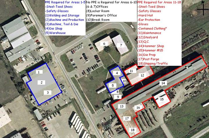 Wear Your Personal Protective Equipment (PPE): The map below (courtesy of Google Maps) shows what PPE is required in each work area; you may wear additional PPE if you wish.